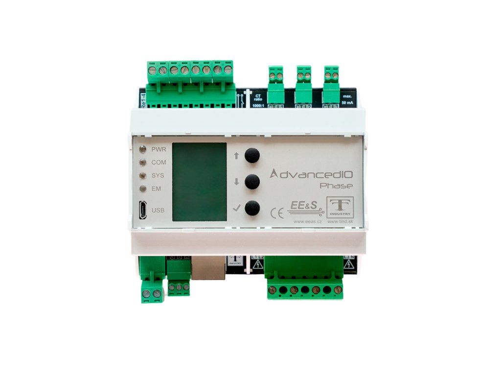 AdvancedIO Phase is a compact device designed to measure electrical energy consumption. AdvancedIO Phase measures phase voltage (directly), current flowing through the phases (bi-directionally and indirectly) and frequency. The device then calculates individual performances, device consumption and can detect a fault on the connected device. AdvancedIO Phase contains 4 switching relay contacts with a maximum switching current of 5A and a voltage of 250VAC, usable for switching the measured load or another element in the installation. The entire device can be part of the Industry 4.0 platform and is controlled via a serial RS485 interface using the Modbus / RTU industrial communication protocol, or via an Ethernet interface using the Modbus / TCP industrial communication protocol. The MQTT connection within the connected LAN is also new. It also includes a display with buttons, which can be used to control individual outputs manually - by the operator. At the same time, it is possible to observe the states of inputs / outputs in real time.The advantage is simple mounting on a DIN rail.